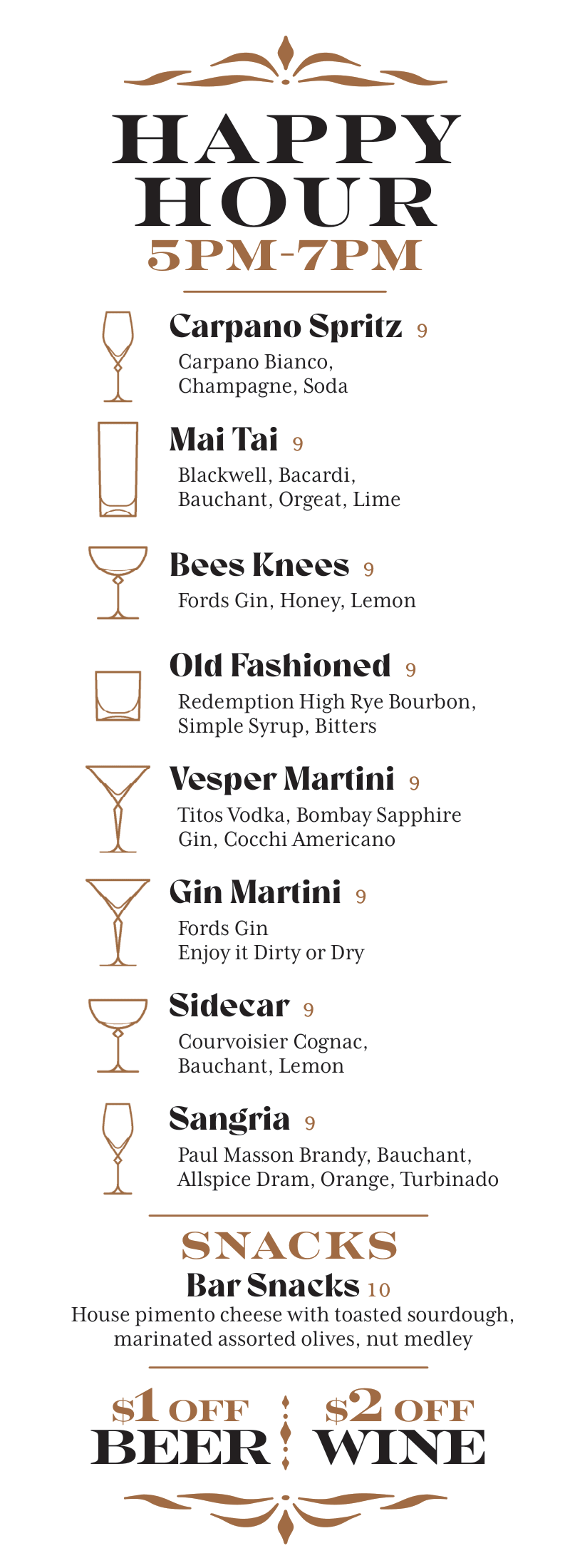 Happy Hour is available every Monday-Friday, 5pm-7pm.